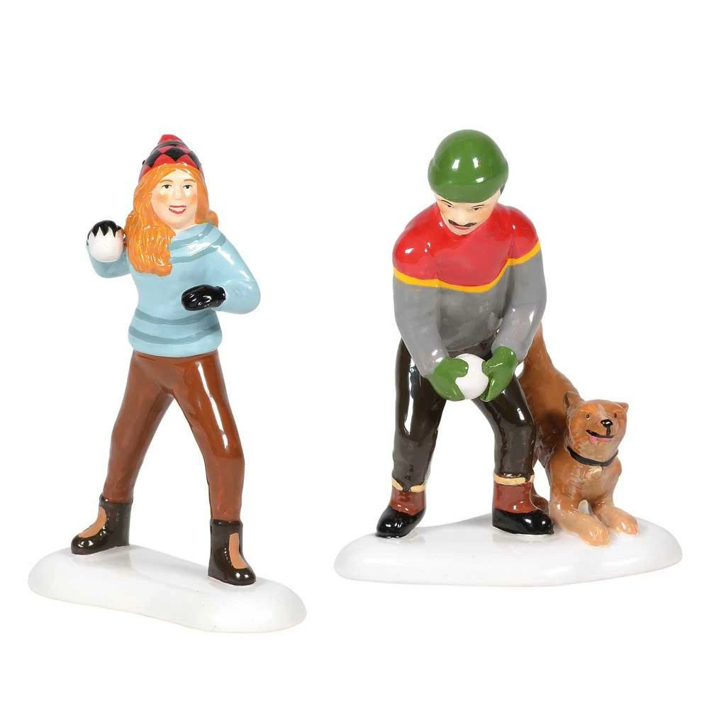 A couple with their dog having a fun snowball fight.